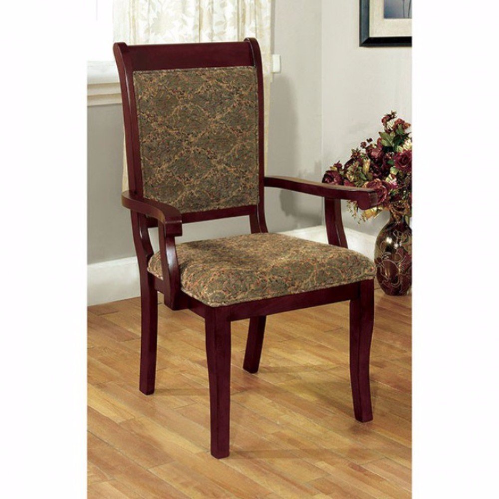 Dine in style with this comfortable traditional style antique cherry finish side chairs available in set of 2. The arm chair is beautifully designed to inspire a sense of elegance. The seat and backrest are upholstered in a fabric upholstery with a beautiful pattern. The armrest provides additional relaxation.