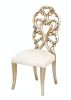 The Palace Platine Cream Side Chair is Hand Carved Mahogany. This Fashionable chair is Hand Made and Hand Finished by the Master Carvers and Finishers of the Heritage company. The Platine finish with hues of Champagne Golden Silver is equally spectacular, a multi step process of actually silver leafing the frames and layering and finishing techniques. The imported Taffeta Fabric offers a neutral balance to this amazing finishing. While this Chair is sold separately. it is often purchased in pairs for Balance. The Platine Collection offers wonderful options to expand your design and consider any of the Platine matching Upholstery and Occasional pieces from this top Quality Collection. All furniture is hand made and finished 1 piece at a time.