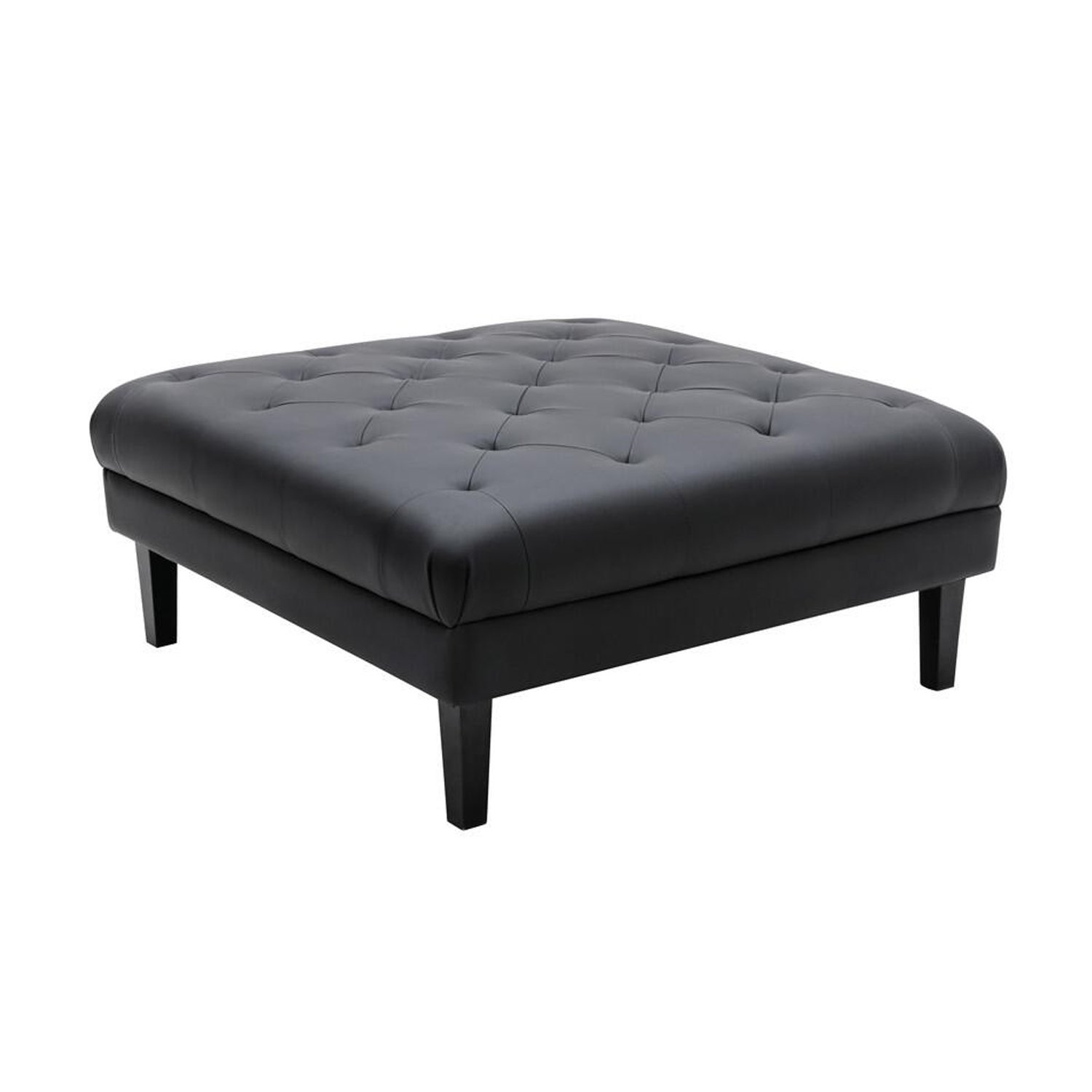 Furnish your living room to perfection with this beautifully upholstered contemporary ottoman. Upholstered in jet black faux leather fabric, it has a button tufted seat and a sturdy rubberwood frame that reinforces its sturdy construction and makes it a stylish and long lasting addition to any modern living room, lounge, or bedroom. Check out our Ella collection for matching items.