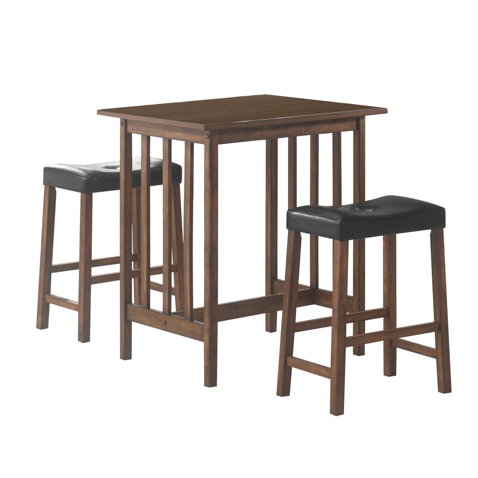 This space-saving three-piece bar set with a lovely look will be a welcome addition to your casual dining area. The counter height table and stools are finished in nut brown and feature straight-line legs for minimal look with casual contemporary appeal. The one buttoned tufted cushion top of the stool adds extra comfort for meals and gatherings in your home.