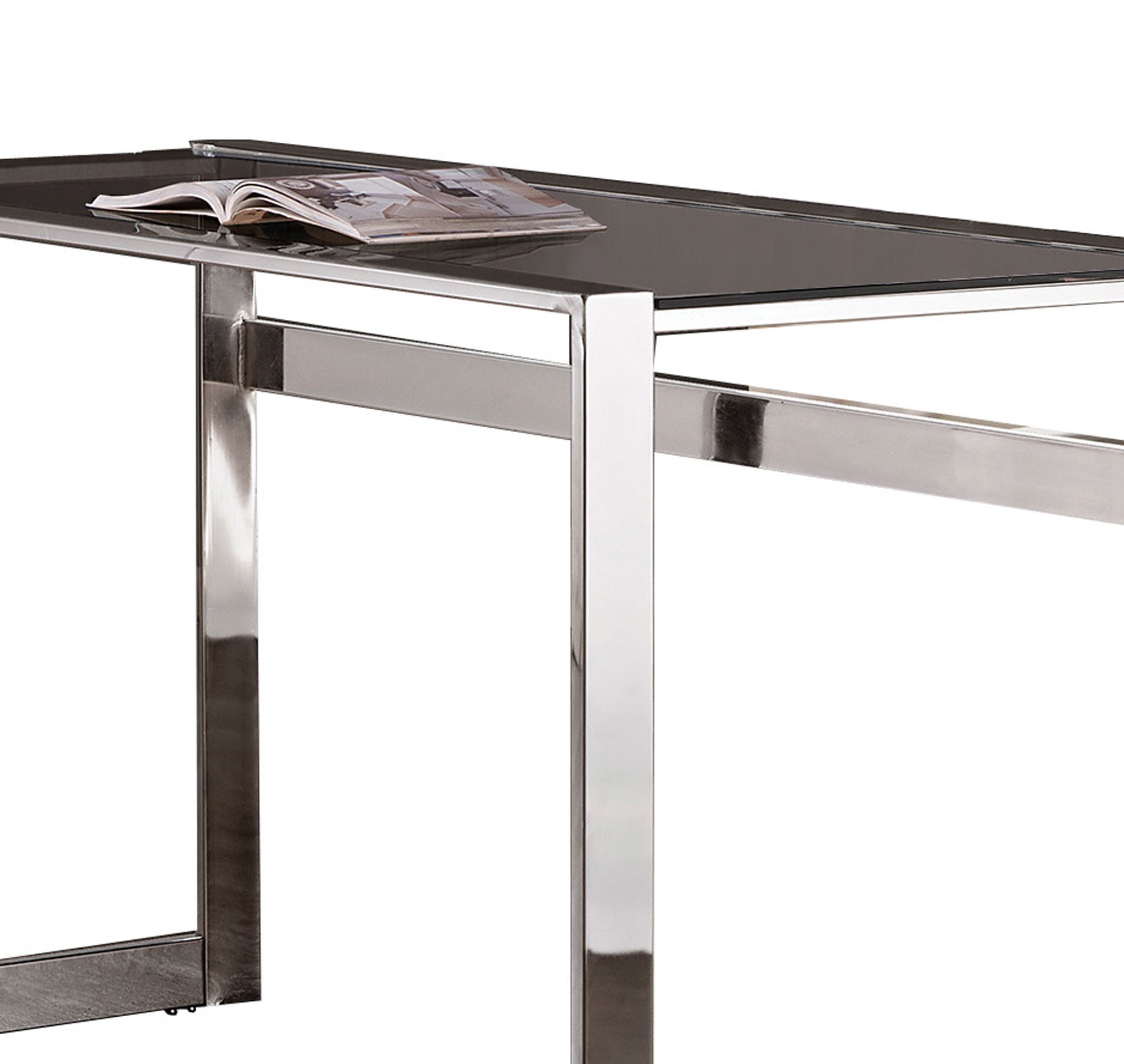 Compact and chic, this essential computer desk features a crisp chrome (Silver) metal finish and an openwork shelf. Straight untapered legs give it an uber modern look that will work perfectly to jazz up your surroundings.. Place it in a corner for a cozy work space.
