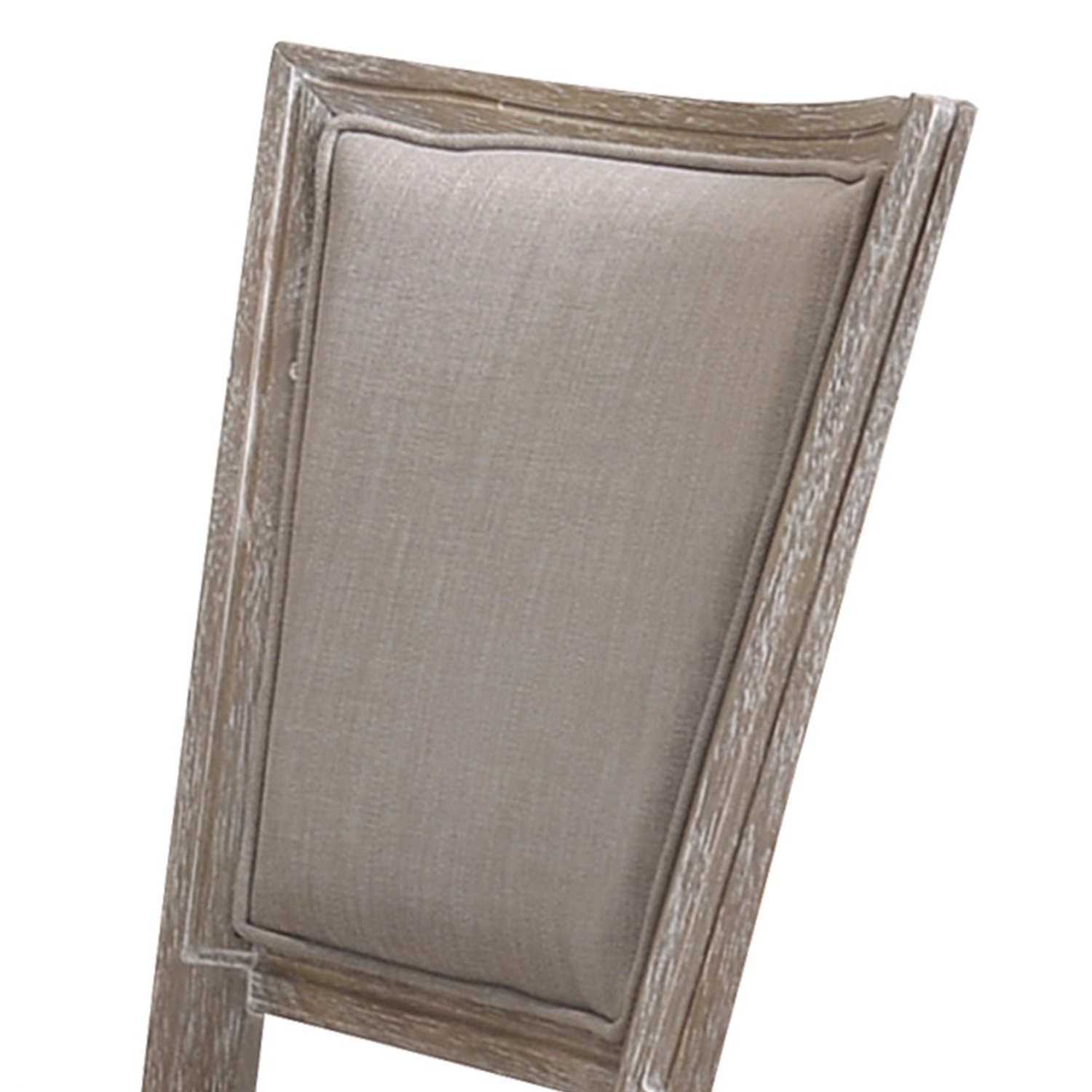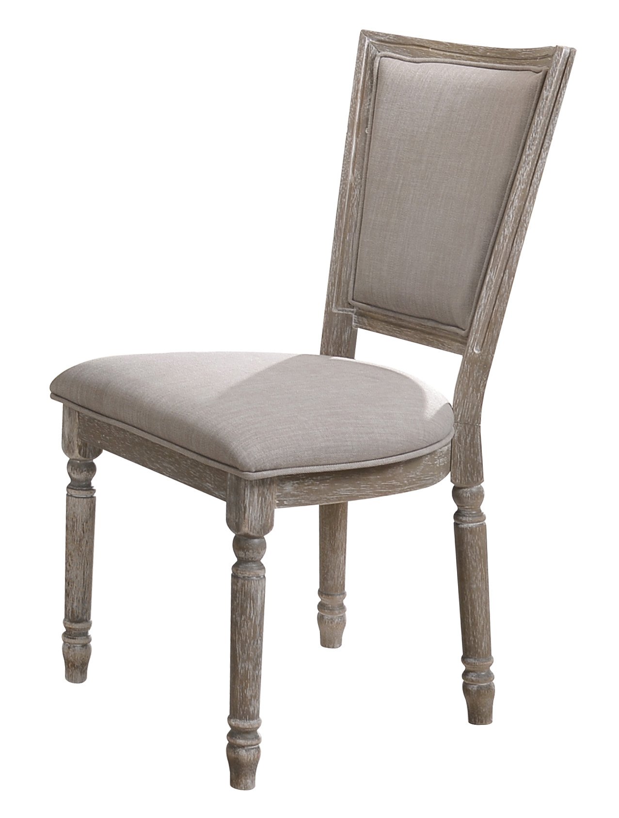 Enrich your seating experience with the inclusion of this transitional style side chair set. Constructed sturdily from wood in a weathered brown finish, it is upholstered in gray fabric and features high backrest. Supported on turned legs for added stability and an attractive look, these chairs are sure to enhance the aesthetics of your dining space, also offering ultimate seating comfort while you enjoy your meals with your friends and family.