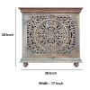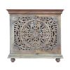 A perfect amalgamation of striking appeal and utility, this cabinet makes an ideal addition to your home. Inspired by the traditional style of furniture, it effortlessly blends with various furniture themes and color palettes. Incorporating a sturdy mango wood construction in a  brown finish, it comes with wood grains and distressed detailing that highlight the skilled craftsmanship involved in making this piece. The two door filigree cutout wooden front opens up ample storage space with a fixed shelf inside for the partition. Supported on bun feet, it finds a perfect place in your living room. Top it off with decorative items to create visual appeal, while the concealed storage offers a clutter free interior.