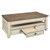 Impart cottage appeal to your living space with this Cocktail Table. Featuring a sturdy construction of veneer, solid wood, and engineered wood in an antique two tone finish with distressed details, the table incorporates a spring lift top. It offers ample storage space with an open shelf and a smooth gliding drawer.