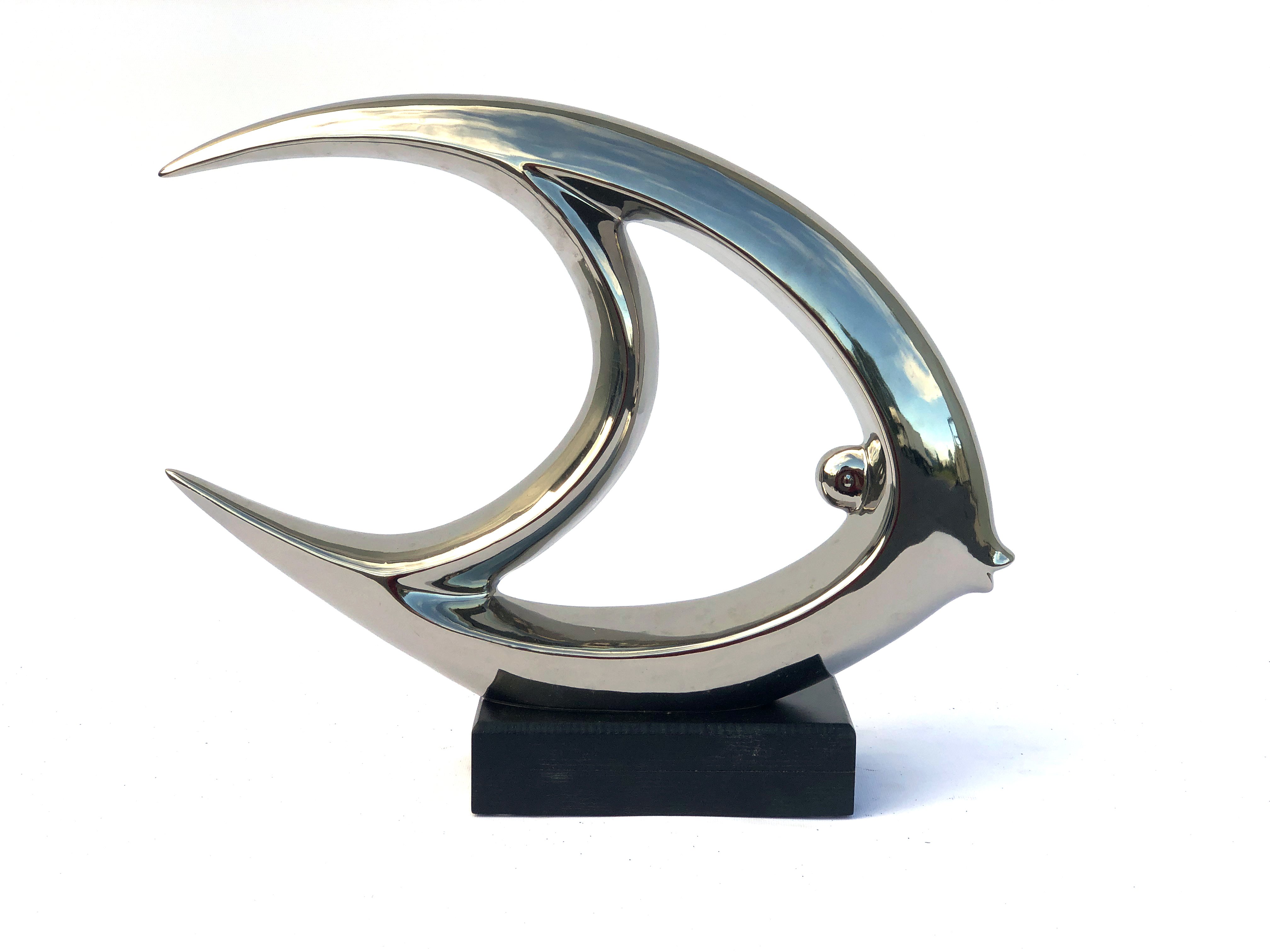 A Mirrored Chrome Fish Set of 2 on Bases. A set of abstract designed Fish attached to contrasting black bases. The design and finish make these an item that can widely be used from a very modern interior to even a Transitional one looking for a pop of abstract freshness. These are Artist sculpted creations, which are then produced by hand casting in porcelain. This decorative tabletop accessory set has a very special finish of chrome plating, which then gets polished to the ultimate in a mirrored silver chrome effect. The wood bases are attached and nicely finished. Another collectible and beautiful decorative accessory brought to you exclusively by AFD Home. No Assembly Required